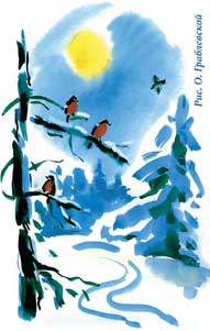 | Пришла зима, темнеет рано, Не слышен птиц веселый крик. Вид белых хлопьев снегопада Дает нам в жизни счастья миг. Хожу по лесу. Воздух чистый. Вдруг вижу стайку снегирей. Они — на ветке серебристой. Их рассмотреть спешу скорей. |