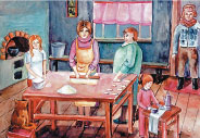 Так назвала свою работу девятилетняя Лиза Чичиндаева из города Сосновый Бор. Посмотришь на ее рисунок и сразу вспомнишь мудрую русскую пословицу: «Вся семья вместе — так и душа на месте!». А ведь семейный портрет — это не просто «художественный перечень» всех членов семьи. Здесь за каждым лицом — свой характер, своя индивидуальность и, вместе с тем, радостное ощущение того, что всем очень хорошо рядом друг с другом. Даже кошкам, даже собакам, которые, хоть и маленькие по размеру и не слишком похожи на людей, но все равно — частичка большой и дружной семьи. Посмотрите, как хорошо вписались они в семейный портрет Насти Рамазановой, трудно даже сказать, кто в этой дружной группе главный. Кот, так тот просто в порыве нежности обнял маму за красивую прическу и всем своим видом говорит: «Никому не отдам!» Значит, очень любит. А к нему тянется с дружеским поцелуем пес. И вся семья тесно-тесно прижалась друг к другу. Потому что вместе — хорошо, радостно, спокойно, надежно. А вы замечали, что в хорошей семье все чем-то похожи? Да-да, даже звери. Они, кстати, с большой охотой принимают участие во всех дружных семейных делах. Посмотрите на рисунок Ани Рудаковской — вон как кот активно помогает лепить пельмени, следит, чтоб получались они толстенькими, ровненькими. А в умелых руках и дело дружно спорится, особенно когда вместе трудятся и стар и млад. Придет с работы усталый папа и сразу улыбнется, потому что встречают его дома любовью и заботой, потому что есть такое заветное место, где его ждут, где тепло и уютно, где царит добро. Такой семьей и гордиться не грех. Особенно если в ней есть такой героический дедушка, как на рисунке Лены Фоменко. Голова седая, а грудь в орденах, много дедушка пережил, много о чем может рассказать своим внукам. Видите, как внимательно слушают его ребята? И будет рассказ о его подвигах с уважением передаваться из уст в уста, из поколения в поколение. Вообще, это очень здорово, когда под одной крышей собирается сразу несколько поколений. И семья была бы не семья без доброй бабушки и без мудрого дедушки. Вон как хорошо и весело внукам рядом с ними — посмотрите на рисунок Сережи Муравьева. У внуков припасено множество идей, множество проказ, в которые они так и тянут включиться бабушку и дедушку, а старшее поколение всегда охотно найдет время для маленьких и любимых сорванцов. И когда-нибудь расскажут они внукам историю начала своей большой и дружной семьи — как они встретились, как полюбили, как поняли, что не могут жить друг без друга. Может быть, все было именно так, как на рисунке Светы Завьяловой — зима, сонный и притихший город за спиной, ласковый свет фонарей, и двое на одной скамье, рядом, плечо к плечу, несмотря на морозы. И цветок в ее руке — как обещание длинной и счастливой жизни в окружении большой и дружной семьи — детей, внуков, правнуков, кошек и собак. Потому что только тогда душа бывает на месте, когда все — вместе!