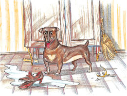 Дома она вела себя сначала неплохо. Мама называла ее «дочкой», а я даже ревновал и сердился: «Разве она мне сестра?» Только собака почему-то отказывалась гулять на поводке, все норовила удрать. Кроме того, злюка была ужасная. Кусалась и рычала по поводу и без повода. Кора могла с удовольствием поиграть с нами, побегать за мячиком или палочкой и обожала копать норки. Норки были ее главной страстью. Норки и грязь. Дома играть специально купленными игрушками Кора не хотела, а развлекалась тем, что грызла обувь и ножки мебели. Сгрызла так, что шкаф чуть не рухнул! Очень полюбила нашего кота Кузю, таскала его за шкирку по всем комнатам, общипала его так, что он потом за год шубу отрастить не смог, так и ходил ощипанный. Жили они дружно, совсем не как кошка с собакой. А потом Кора подросла и папа сказал, что она становится опасной. Папа взялся за дрессировку. У папы было много собак, и даже очень серьезные немецкие овчарки, но вот с Корой он справиться не мог. У него даже руки опустились, ну никак не хотела Кора становиться цивилизованной, домашней собакой! А потом по Интернету вычитали, что ягд-терьеры совершенно непригодны для домашнего или комнатного содержания! И все стало ясно: собака не домашняя, а охотничья.