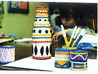 Такую вазочку может сделать каждый! Основа — стеклянная бутылка или жестяная банка из-под консервов. Ее нужно обмотать хлопчато-бумажной веревкой или шерстяной нитью. Веревка приклеивается к основе клеем ПВА. Затем с помощью клея прикрепляется тесьма, сутаж, лента, пуговицы, бусины. Начать работы следует с эскиза орнамента.