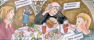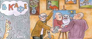 2-3. Художник повел Спектровых в свое любимое кафе, которое отличалось весьма необычным меню. Друзья заказали жареный картофель по рецепту времен царя Иоанна Грозного, итальянский салат из помидоров "Четырнадцатый век", а художник потребовал луковый суп, приготовленный по рецепту национальной кухни древних египтян.