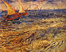Совсем другое отношение к краске и поверхности холста у великого голландца Ван Гога. Для его живописи характерны темпераментные красочные мазки, передающие ощущение нервной энергии мастера. Фактура словно раскрывает процесс его работы над полотном. Плотные рельефные мазки лепят пенящиеся белые гребни волн, которые словно выплескиваются через поверхность холста.