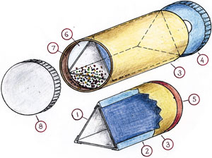 Калейдоскоп готов. Если его слегка наклонить и взглянуть в окошечко, то можно увидеть красочный орнамент. Это разноцветные частички отражаются в зеркалах. Чуть повернешь калейдоскоп, и появится другой узор, еще лучше прежнего, такой замечательный, что трудно взгляд оторвать!