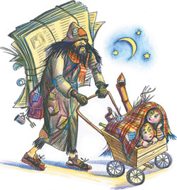 Пробило девять часов вечера, ребята на цыпочках вышли из дома и очутились на темной улице. В небе тускло светила луна, и Гек с Линой разглядели старьевщика, катящего свою тележку. Они тихонько подкрались к тележке и, улучив мгновение, живо очутились в ней.