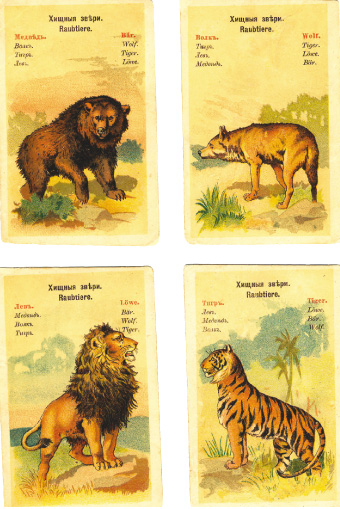 Эти карты были изданы в России в начале XX века. С ними изучать животный мир — одно удовольствие. Рисунки на этих картах реалистичны и красочны, тебе они понравятся. У этих карт есть еще одна особенность, все названия приведены на двух языках — русском и немецком, поэтому ты можешь учить не только зоологию, но и немецкий язык.