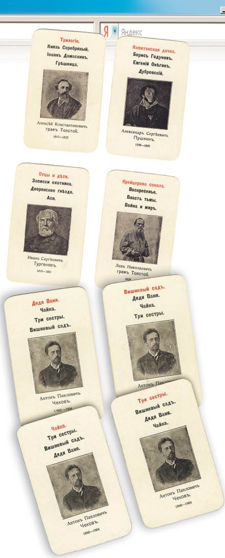 Зоологию, немецкий язык и географию ты уже изучал, займемся теперь изучением литературы. В этом тебе поможет квартет по русской литературе начала XX века. Играя в этот квартет, ты познакомишься с русскими писателями XVIII, XIX и XX веков и с их произведениями, а если ты уже с ними знаком, то закрепишь свои знания.
