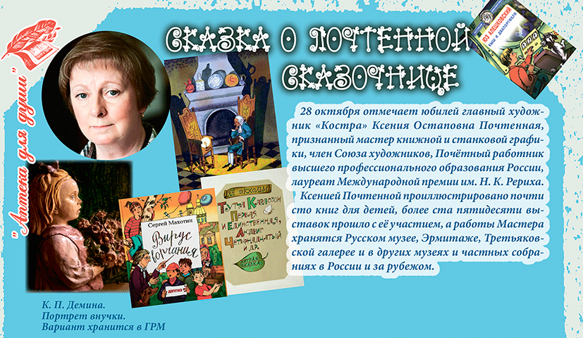 28 октября отмечает юбилей главный художник «Костра» Ксения Остаповна Почтенная, признанный мастер книжной и станковой графики, член Союза художников, Почётный работник высшего профессионального образования России, лауреат Международной премии им. Н. К. Рериха. Ксенией Почтенной проиллюстрировано почти сто книг для детей, более ста пятидесяти выставок прошло с её участием, а работы Мастера хранятся Русском музее, Эрмитаже, Третьяковской галерее и в других музеях и частных собраниях в России и за рубежом.