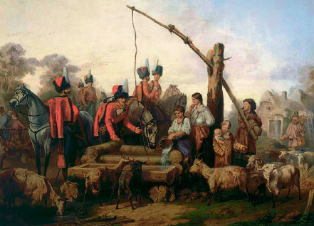Картина М. О. Микешина «Лейб-гусары у водопоя» (1853 г.) показывает форму гвардейских кавалеристов времен Крымской войны |