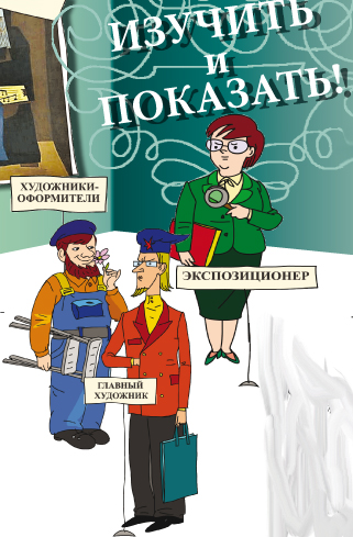 Предметы надо расставить и развесить так, чтобы наш посетитель мог рассмотреть их во всех деталях. Возможно, понадобится заказ особых витрин и подсветки. К предметам нужно сделать пояснения, и лучше сразу на двух языках — ведь в музей будут заходить иностранные туристы. Для экспозиции могут понадобиться карты или схемы — их нужно придумать и напечатать. Всю эту работу делают музейные ЭКСПОЗИЦИОНЕРЫ в сотрудничестве с ГЛАВНЫМ ХУДОЖНИКОМ и ХУДОЖНИКАМИ-ОФОРМИТЕЛЯМИ. Для того чтобы написать хорошие пояснения к предметам, сотрудники музея проводят исследования, работают в библиотеках, архивах и других музеях.