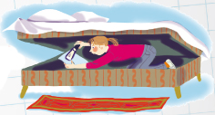 Маша спряталась в кровати, в отделении для постельного белья. Она боялась темноты и взяла с собой фонарь.