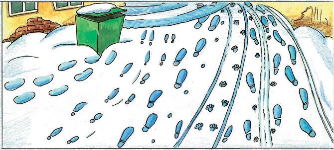 Кеша стал читать следы: старик Петр Георгиевич, опираясь на палочку, пошел в булочную. Баба Зина выносила утром мусор. Тетя Марина с Антошкой проспали и в детский сад поехали на машине. Серафима Петровна поползла на рынок за овощами со своей вечной сумкой-тележкой. Димыч вытащил гулять пекинеса Укси-чемпиона, а Саша катается с Джоном... Кто съел пирог и кто потерял ключи? За правильный ответ — 15 очков.