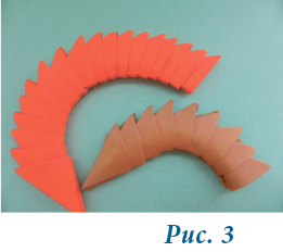 3. Хвост собираем из пяти отдельно сложенных в дугу перышек (рис. 3). Каждый последующий модуль вставляется в предыдущий. Можно их сделать разными по цвету. Среднее перо самое длинное — из 21 модуля. Два соседних — по 20 модулей. Два крайних — по 10 модулей. Перья хвоста вклеиваем и красиво расправляем (рис. 4). Петушок готов!