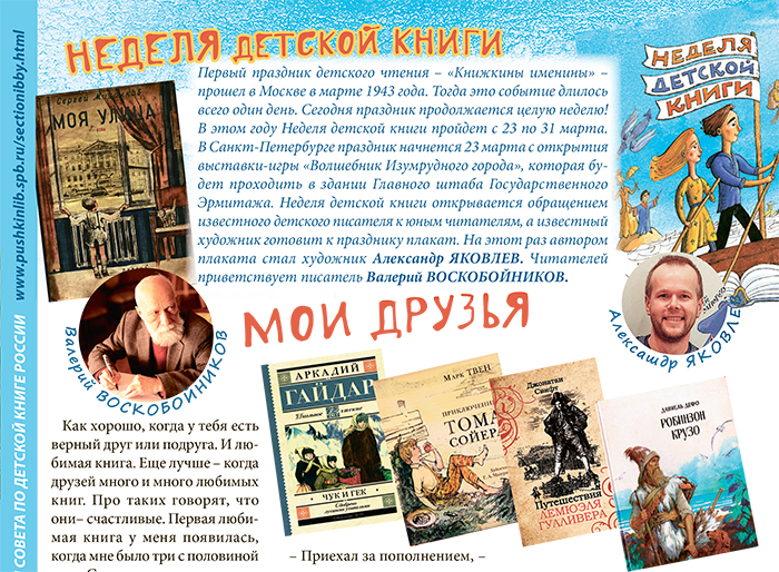 Первый праздник детского чтения — «Книжкины именины» — прошел в Москве в марте 1943 года. Тогда это событие длилось всего один день. Сегодня праздник продолжается целую неделю! В этом году Неделя детской книги пройдет с 23 по 31 марта. В Санкт-Петербурге праздник начнется 23 марта с открытия выставки-игры «Волшебник Изумрудного города», которая будет проходить в здании Главного штаба Государственного Эрмитажа. Неделя детской книги открывается обращением известного детского писателя к юным читателям, а известный художник готовит к празднику плакат. На этот раз автором плаката стал художник Александр ЯКОВЛЕВ. Читателей приветствует писатель Валерий ВОСКОБОЙНИКОВ.