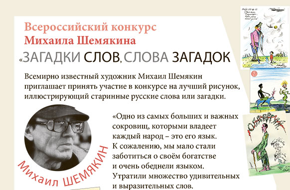 Знаменитый художник Михаил Шемякин приглашает принять участие в конкурсе на лучший рисунок, иллюстрирующий старинные русские слова и загадки.