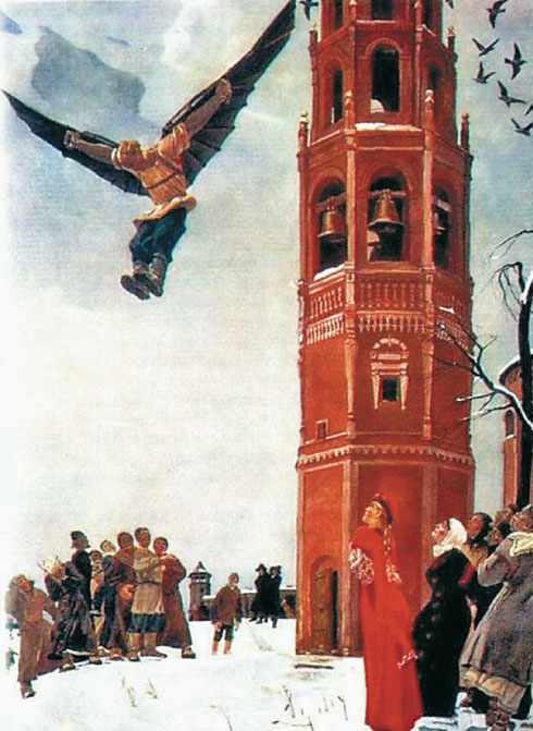 Среди славян тоже находились смельчаки, мечтающие о полетах. Как отмечали в летописи, «иные слетают с церкви или с высокого дома, сделав крылья наподобие голубиных, но значительно большие по размеру». Вот и на картине А. Дейнеки крестьянский мужик под крики толпы слетает с высокой колокольни.