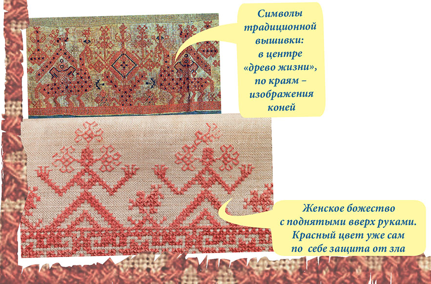 Символы традиционной вышивки: в центре «древо жизни», по краям — изображения коней. Женское божество с поднятыми вверх руками. Красный цвет уже сам по себе защита от зла