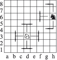 Белые кони стоят на белых полях, черные – на черных. Кони перемещаются (ходят) так же, как в шахматах: на два поля по вертикали или горизонтали и сразу на одно поле в сторону (см. д. 2).