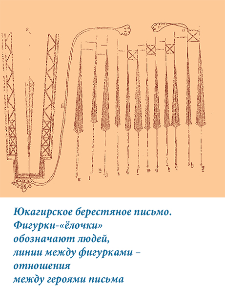 Юкагиры-мужчины в своих письмах рассказывали дружественным соседним родам об успешной охоте на лосей. Такие письма, похожие на простейшие карты местности, оставляли на тропах, чтобы соседи, которым повезло меньше, могли найти удачливых охотников и спастись от угрозы голода. А у юкагирских девушек была письменность-игра! Игровые «тосы» рассказывали об отношениях молодых людей: кто кого любит, кто по кому скучает, кто о ком думает№ Люди изображались в виде узких фигурок, похожих на ёлочки. Игра заключалась в том, чтобы понять, кто из знакомых скрывается за каждой ёлочкой. Разгадывали такие письма-ребусы на осенних праздниках, когда юкагирская молодёжь собиралась большими компаниями.