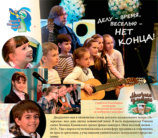 Двадцатого мая в знаменитых стенах детского музыкального театра «Зазеркалье» весь день звучал заливистый хохот. В честь выдающегося Учителя смеха Леонида Каминского гремел финал конкурса «Ваш веселый звонок — 2015». Уже с порога гости вовлекались в атмосферу праздника и становились не просто зрителями, а участниками удивительного театрального представления.