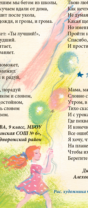 * * * Мама, мама моя родная! Утром, в школу меня провожая, Тихо скажешь: «Удачного дня!» И с уроками мне поможешь — Где похвалишь, а где пожуришь. И конечно же, вкусно накормишь. Все ошибки мои простишь. Я хочу, чтобы мамы были На планете у всех детей. Чтобы их очень сильно любили! Берегите своих матерей! |