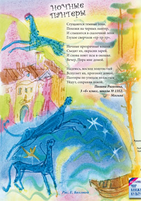 Залив в летнюю ночьШевелит песок волна.На песке растет сосна. Лодка старая лежит. Чайка белая летит. Над заливом тишина. В тучи спряталась луна. Все вокруг как будто спит, Лишь сосновый бор шумит. Ночные пантерыСгущаются темные тени,Похожи на черных пантер, И слышится в сказочной лени Глухое сверчков «тр-тр-тр». Ночные прозрачные кошки Съедят их, окрасив зарей. И снова поют псы в окошке. Вечер. Пора мне домой. Надеюсь, восход золотистый Вспугнет их, прогонит домой. Пантеры по улицам мглистым Уйдут, сохраняя покой. ![]() |