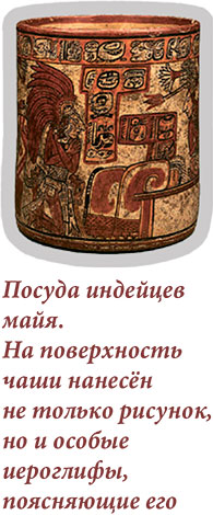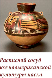 А теперь отправимся на другую сторону Земли, в Америку. Жители Нового Света сумели изобрести керамику самостоятельно и независимо от обитателей Евразии. Древние индейцы тоже освоили роспись по глине и начали рисовать на посуде сложнейшие узоры, целые сюжетные композиции. Конечно, изображали они в первую очередь мифы, объяснявшие устройство мира в представлении ацтеков, майя и других народов Центральной и Южной Америки. О мифах древних индейцев рассказывали не только рисунки, но и сама форма сосудов, которые часто делали в виде головы или целой фигуры какого-нибудь бога. Такая посуда (она, вероятно, использовалась в различных обрядах) хорошо известна в культуре мочика — древних жителей Перу.