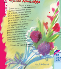 Сегодня день последней встречи.первой учительнице Кружится лист печальный клена. И замер мир, как будто Вечность На нас взглянула удивленно. Всё те же девочки, мальчишки, Всё те же бантики, букеты. В последний раз… Нет, это слишком! Как не согласны мы на это! Все повторится — раз за разом. Чихает микрофон в простуде, Уже пора идти по классам. Уже пора… А нас — не будет. Свои подвыросшие тени Оставим в школьном коридоре. Волнисто — как определенье — Бежит в душе тоска по школе. Звенит звонок. Но как же рано! Вернуться бы назад, к истоку! Звонок звенит. И слов не надо — Мы все взрослеем понемногу… |