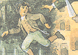 Александр, как конь, подхлестнутый ударом кнута, делает решительный рывок и — ура! — выкарабкивается наконец из злополучной бадьи. Почувствовав под ногами твердь, он из всех сил пускается наутек. На секунду оглянувшись, Александр видит, как бакалейщик с перекошенным лицом и длиннющим ножом в руках — тем самым, которым он только что разрезал шоколад — выбегает из своей лавчонки и устремляется в погоню за ним.