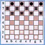 На диаграмме 1 начальная расстановка. Внешне все похоже на обычные шашки, но: