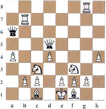 1)а4 2)Н4 3) КсЗ 4) Kf3 5) ЛаЗ 6) ЛНЗ 7) Лb3 8)Лg3 9) d4 10) Фd3 11) Фе4. "Магарадже" остается все меньше безопасных клеток. Но кольцо продолжает сужаться. После 12) Лb7 13) Фd5 14) Лg8 остается только две клетки, на которых может находиться "магараджа", — f6 или а6 (рис.). В любом случае белые легко выигрывают. Попробуйте сделать это сами, у вас все получится.