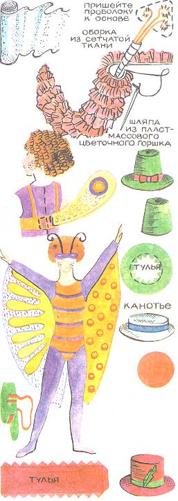 Каркас для крыльев бабочек, стрекозок и фей делай из гибкой проволоки, которую обтяни смазанной клеем суконной ниткой. После этого каркас смажь клеем и натягивай на него легкий материал сетчатый, прозрачный или полупрозрачный. Когда работа просохнет, лишнюю ткань состриги ножницами. Можно обтянуть каркас полиэтиленом. Пленку вырежь по размеру чуть больше каркаса, наложив на него, загни и аккуратно пришей или приклей липкой лентой. Крылья пришей к нагрудному ремню с лямками. Не забудь только сделать прорези в костюме, чтобы пропустить через них крылья.