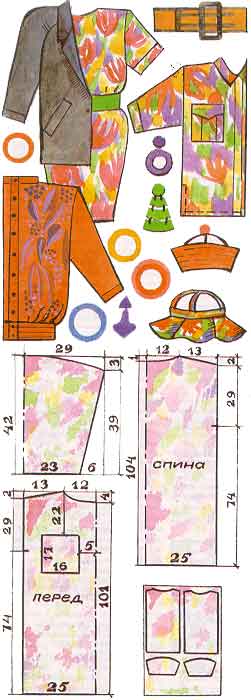 Кофточка, рубашка и платье сшиты по одной выкройке (размер 44 - 46). Выкройка проста, не так уж сложна и сама работа, но, разумеется, я предлагаю ее только тем, кто занимается шитьем и имеет опыт. Если ты хорошо шьешь, можно усложнить фасон карманом, планкой, идущей от ворота, можно присборить кофточку и посадить ее на поясок. А если ты можешь назвать себя настоящей рукодельницей - укрась готовую вещь аппликацией. Материал для нее должен выбираться в зависимости от ткани, из которой сшита вещь. На легкой кофточке аппликацию делай из тонкого шелка, тюля, старого кружева, на плотном же платье - из кожи, сукна.