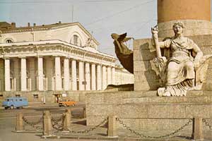 Central Navy Museum (formerly the stock Exchange) and a sculpture by the Rostral Columns. 1805-10, architect Th. de Thomon, sculptors I. Camberlen and J. Thibaud, stonemason S. Sukhanov.