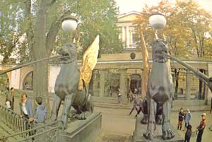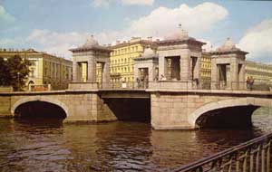 Банковский мост через канал Грибоедова. 1825 - 1826 гг., инженер Г. Третер, скульптор П. Соколов. Здание финансово-экономического института (бывший Ассигнационный банк). 1783 - 1790 гг., архитектор Д. Кваренги.