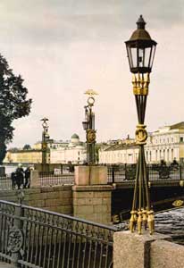 На первом плане: фонарь и решетка Первого Инженерного моста через Мойку. 1828 - 1829 гг., инженер П. П. Базен. На втором плане: фонари и решетки моста Пестеля (бывшего Пантелеймоновского) через Фонтанку. 1907 - 1914 гг., архитектор Л. И. Ильин, инженер А. П. Пшеницкий.