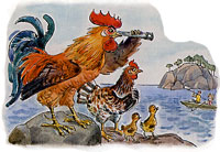 — Я — петух-чебетух, Я — певун-лопотун, На коротких ногах, На высоких пятах. На плече косу несу, Лисе голову снесу.