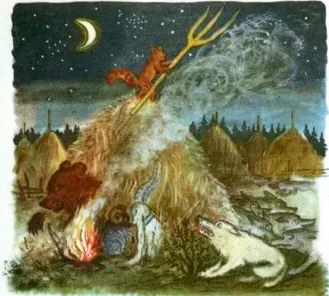 — Ладно, — молвил серый кот, — теперь обогреемся, — да за словом и затопил стог сена.