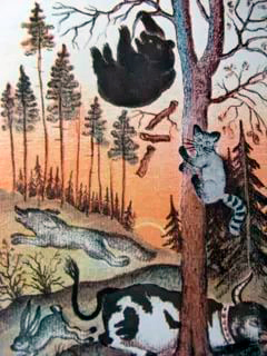 А козел да баран тем времечком подхватили мурлыку и побежали в лес и опять наткнулись на серых волков. Кот вскарабкался на самую макушку ели, козел с бараном схватились передними ногами за еловый сук и повисли.