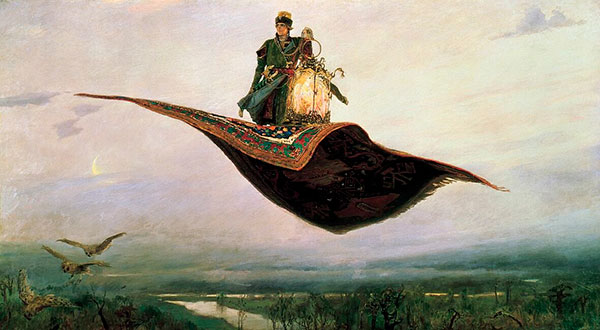 — Братцы! — говорит, — отпускайте своих добрых коней на волю да садитесь ко мне на ковёр-самолёт.