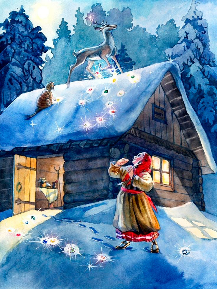 Тут вспрыгнул козёл на крышу и давай по ней серебряным копытцем бить. Как искры, из-под ножки-то камешки посыпались. Красные, голубые, зелёные, бирюзовые — всякие.