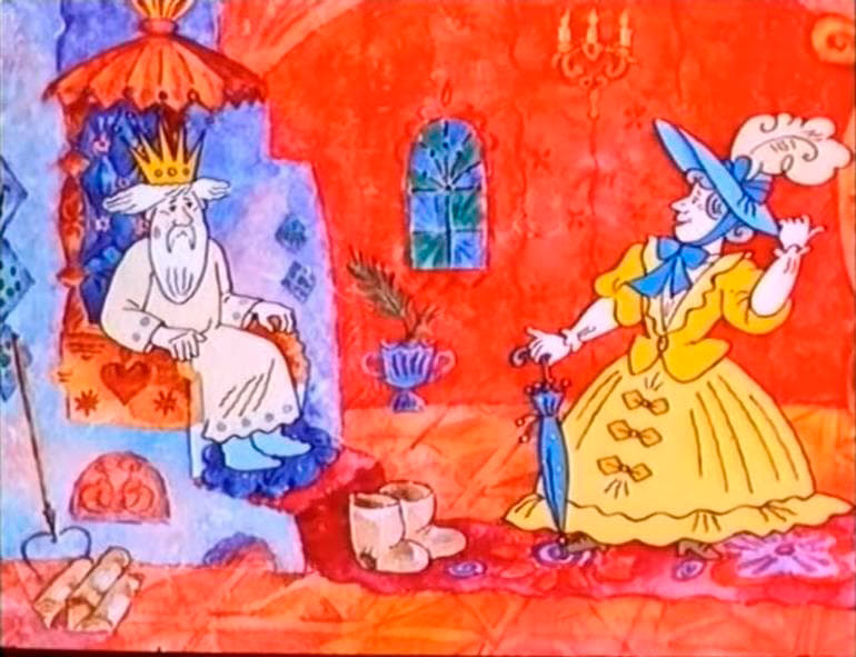 Такой шум подняла! Король услыхал крики, глянул в окно и велел допустить к себе старушку. Вот вошла она в комнату и поклонилась королю.